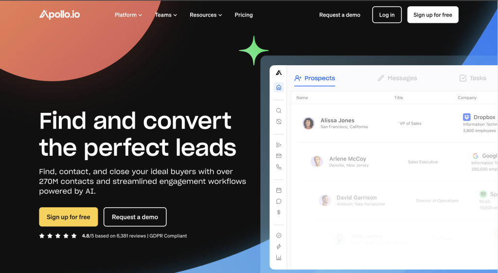 Extensive Prospect Database: Apollo offers access to a vast prospect database with over 250 million contacts, complete with verified phone numbers, email addresses, and job titles. You can also filter these prospects based on more than 200 attributes, ensuring you target the right leads.