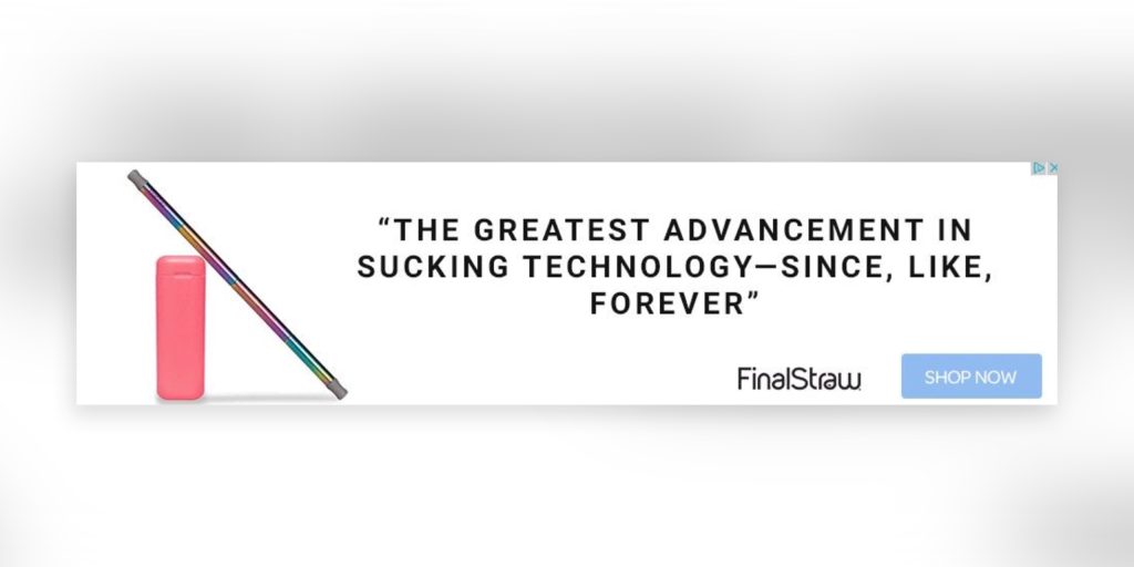 The revolution to get rid of plastic straws is at an all-time high these days. This PPC ad banner here is clearly hinting at a straw that is great and advanced. “Final Straw” as the brand name is a no-brainer. The goal of the product is to end your need to get separate straws every time you need one. A viewer is likely to be intrigued to click the ad and find out more about the straw.